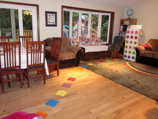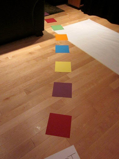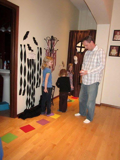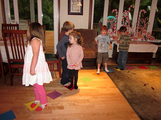 When everyone got there, we played the game.  I had taken out the colored cards from the board game and each kid drew a card and moved to that color square on the floor.  There are a ton of pictures, so I will just post a bunch!