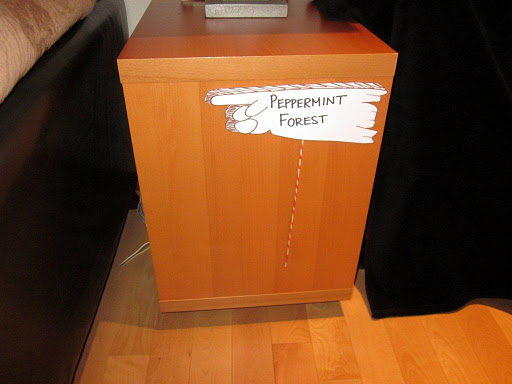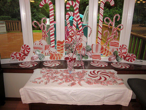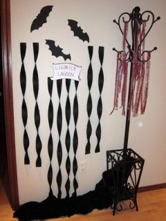 Here, I hung streamers to hopefully look like black licorice and the coat rack worked perfectly to make the licorice tree!