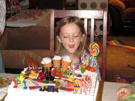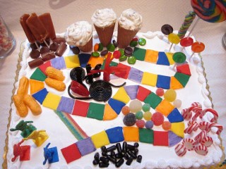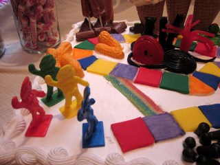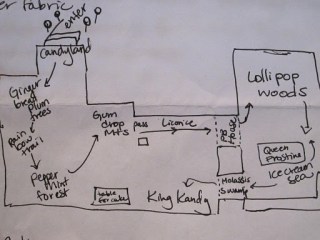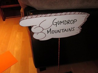 I did have a hard time getting started, so first I studied the candyland board games:  we have an older one and the new style one.  I actually used more from the older one, because I liked the variety of candy characters/places better.  The new board is a little too.. um.. busy… and the candies are a little more similar to each other.  Anyhoo… so I made of list of the “areas”:  Plum trees, rainbow trail, peppermint forest, gumdrop mountains, Licorice Castle (changed to Licorice Lagoon from the newer game), Peanut Brittle House, Lillipop Woods, Ice Cream Sea, Molassis Swamp (changed this to Chocolate Swamp), and last, but not least the Candy Castle.  I just started brainstorming ideas for each area and jotting those down.