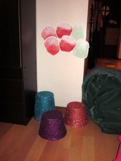 I added glue and glitter to these popcorn and trash buckets from the dollar store to make them look like gumdrops.