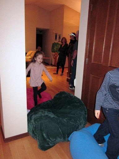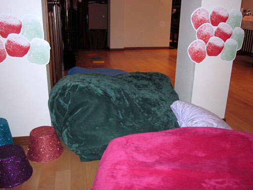 I pinned bright colored blankets over beanbag chairs and pillows to make them look like the gumdrop mountains and the kids had to climb over them!  🙂