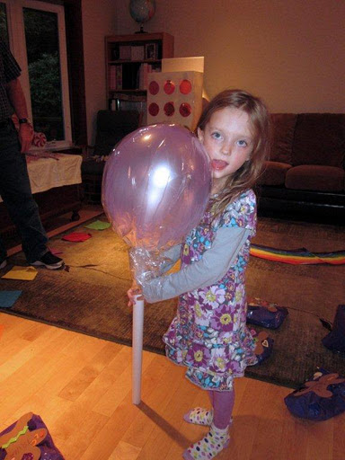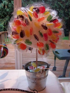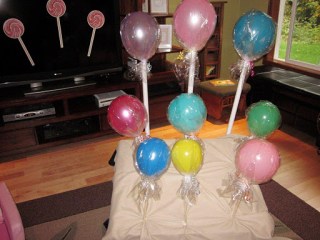 more cellophane covered ballon lollipops.  didn’t know how to get them to stand up, so I propped up a baby gate and covered it with a blanket.. then stuffed in the dowels.  (note that the bigger 3 lolli’s are attached to white wrapping paper rolls and the 6 smaller lolli’s are on wooden dowels)