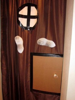 hung 2 brown curtaina that I had in my dining room, with pressure rods over the doorway for Grandma Nut’s peanut brittle house.
