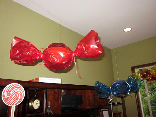 The giant lollipops are made from ballons taped to a baton I found at the dollar store and then wrapped in cellophane.  I stuck them in buckets filled with sand to keep them upright.
