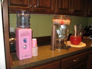 Antarctica was in the kitchen, but we needed tables, so it was more of a fly by Antarctica (too cold to stop there anyway, right?) The activity for here was melting their ice to find the prize inside. We gave each girl a cup of hot water to melt their ice cube and inside was a chain (so they could put their charms on it)
