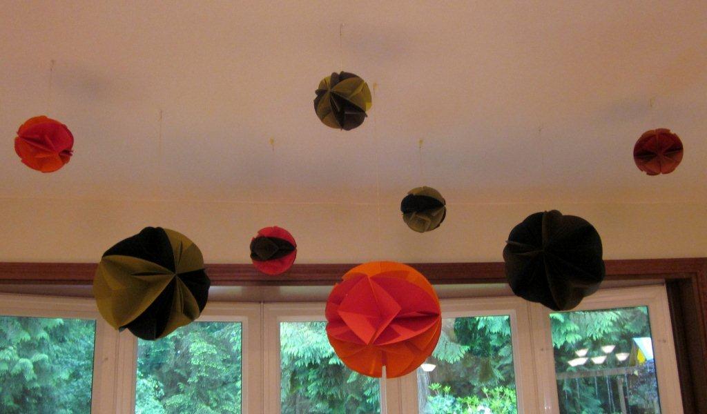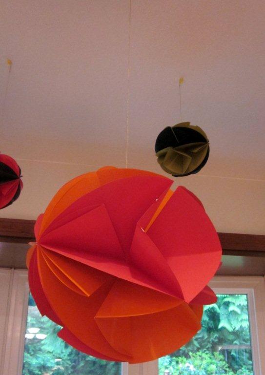 | I found these awesome hanging decorations here. They were pretty easy to make. The large ones take 12 sheets of 12X12 paper… the small ones that I made are 5 1/2″ diameter. |