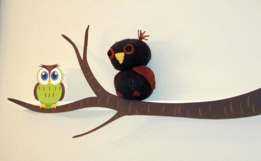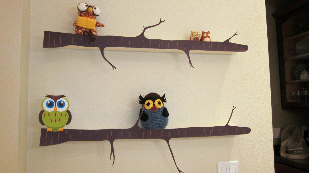 | Printed out these branches (actually 4 sheets, glued together) and covered my picture frame shelves with them. I am really happy with how they turned out and it was such an easy way to add to the decor. The green owl is also a printout. Thanks to a friend, I was able to borrow some owl things (top shelf) and found a couple crochet patterns online and made a couple more.) |