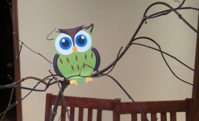 | Owl printout (2 sheets glued together to be double sided) and I didn’t glue the bottom, so that it could just sit in the branches. |