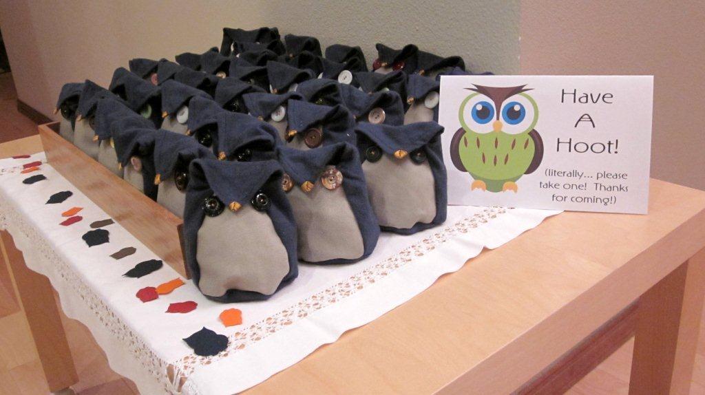 | These are the party favors. I sewed these little owls sorta using THIS idea (original pattern here), but redesigned the pattern a little to make them able to open … and used a small piece of velcro to hold the beaks shut. Then I made some homemade caramel corn to fill them with (in little baggies) … I just used up buttons from my collection, so each owl was one of a kind. |